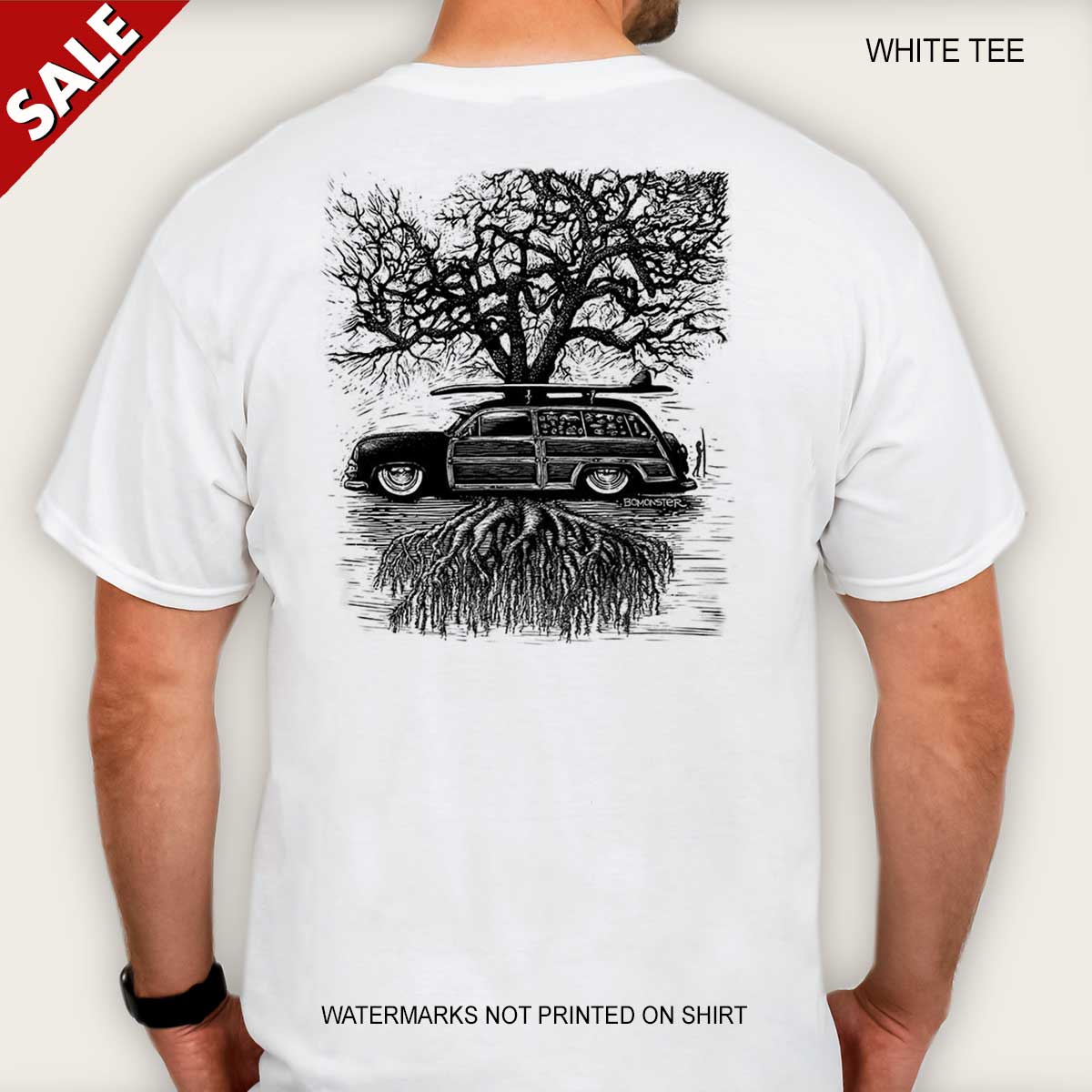 - Old Ford surf woody with surfboard in front of Oak tree roots
