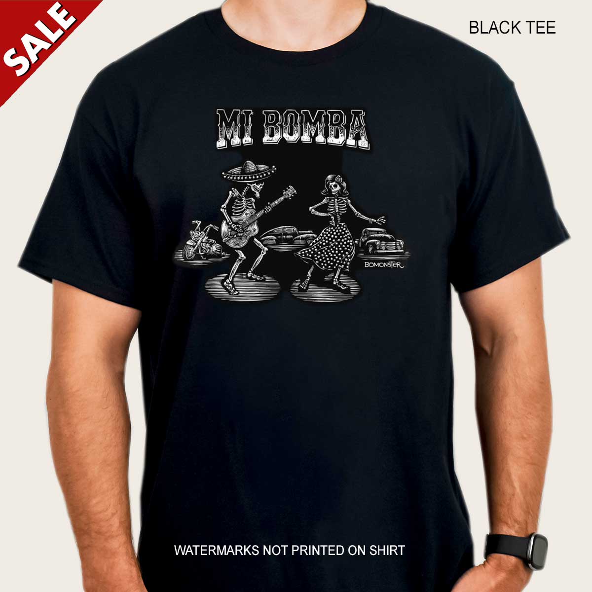 - Skeleton guitar player performs for rockabilly skeleton girl at lowrider car show