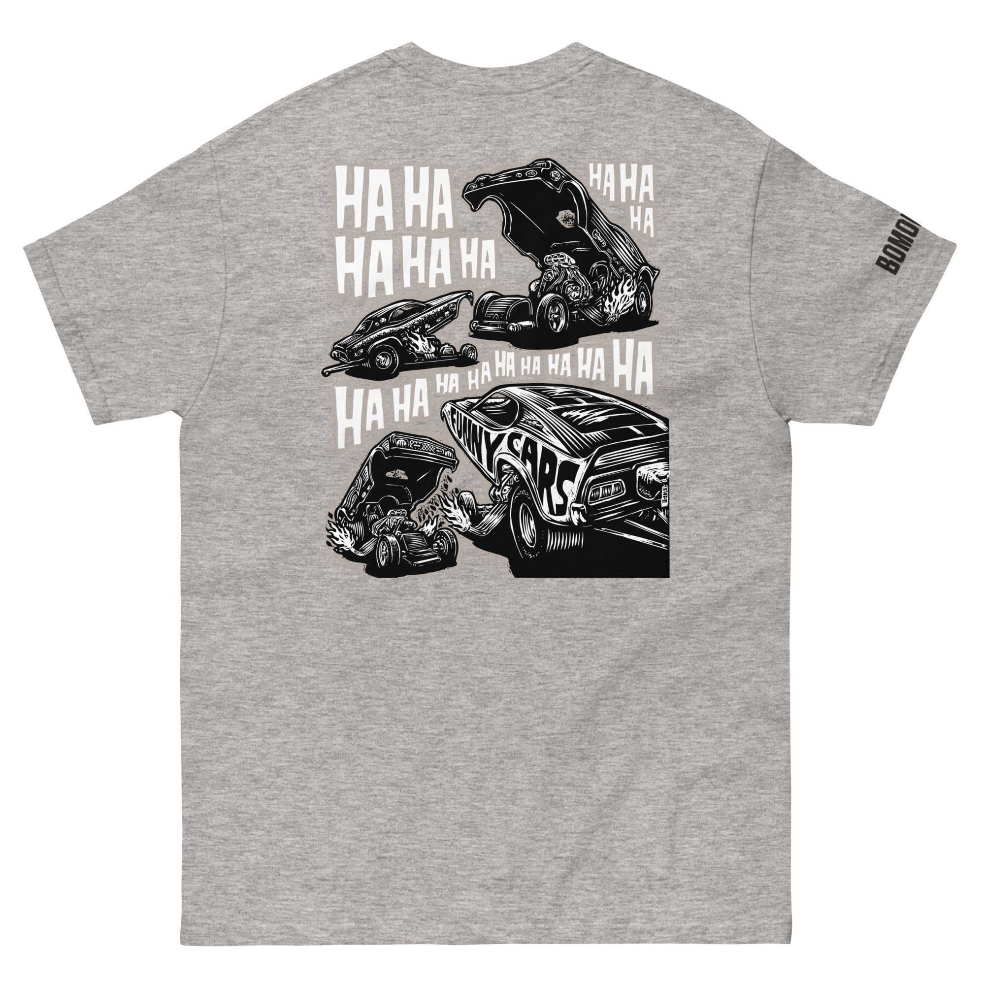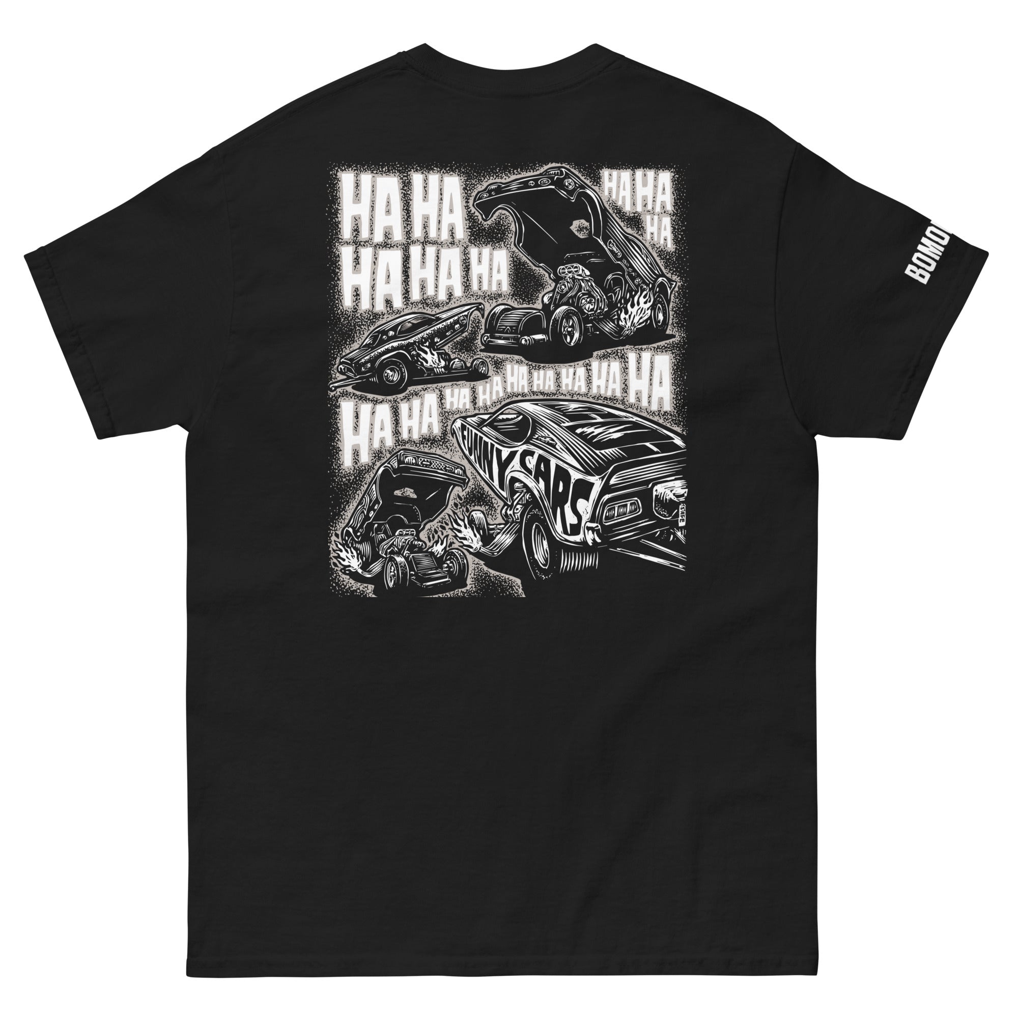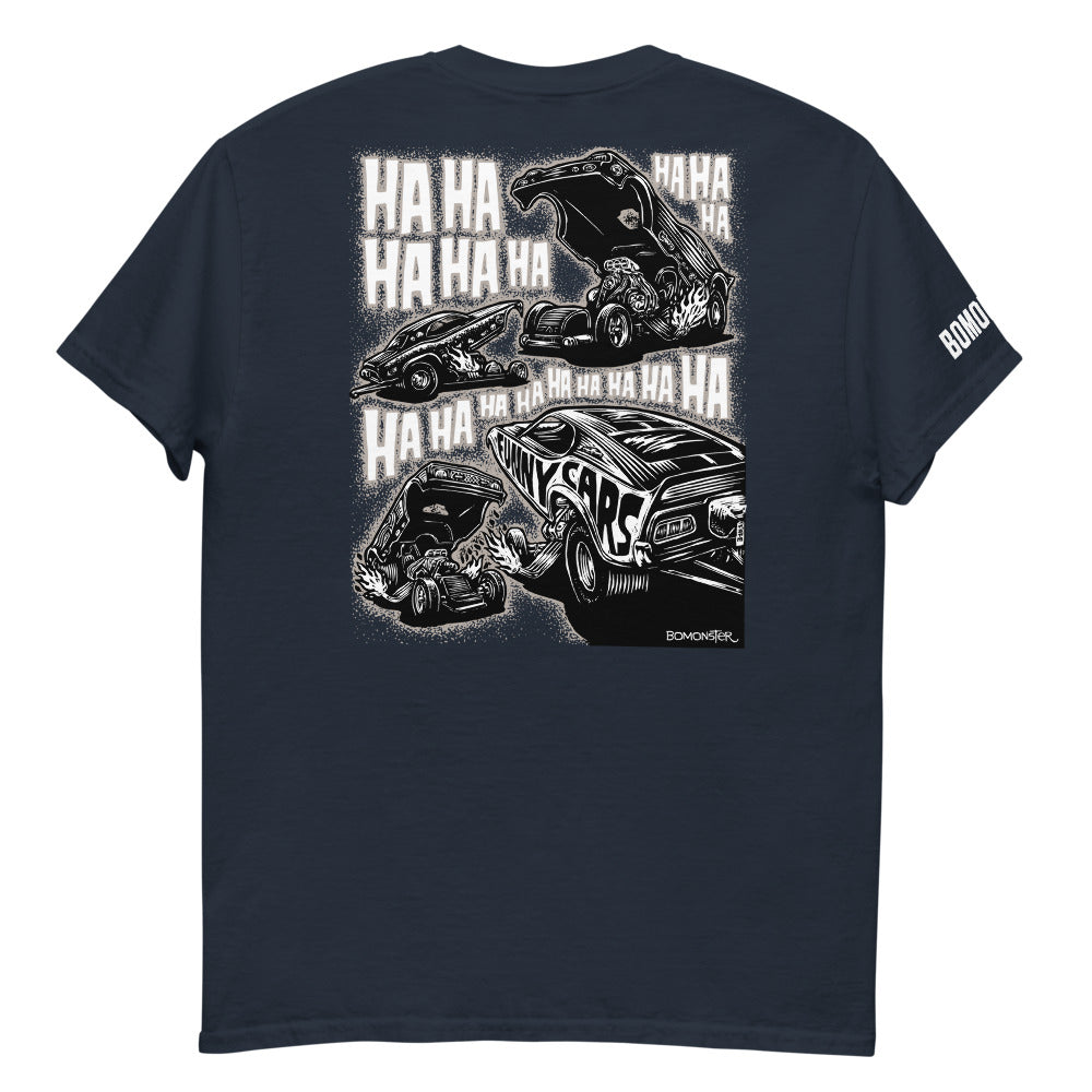 What do funny cars laugh at during a drag race? Who knows? But here they are whooping it up on this original drag racing BOMONSTER design.