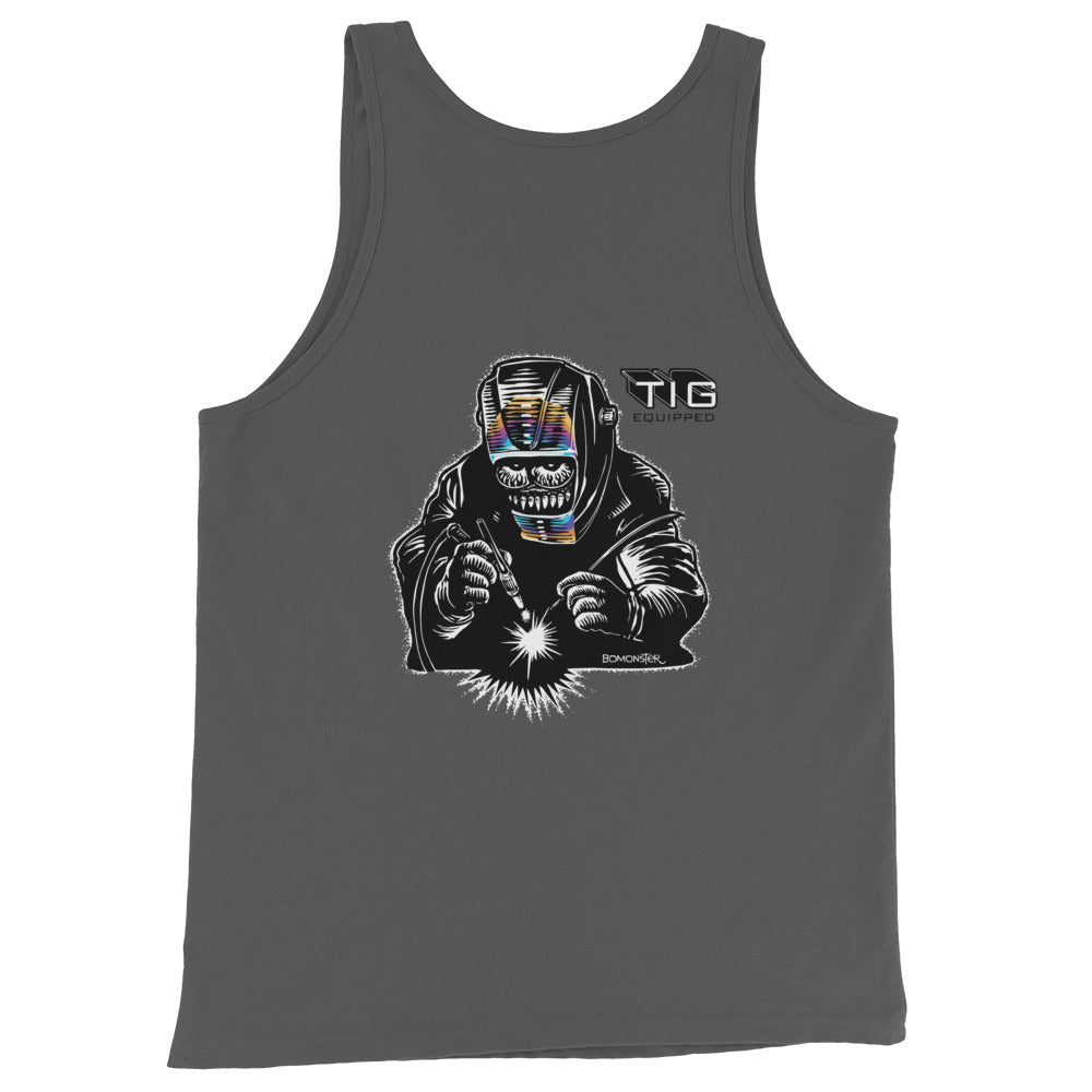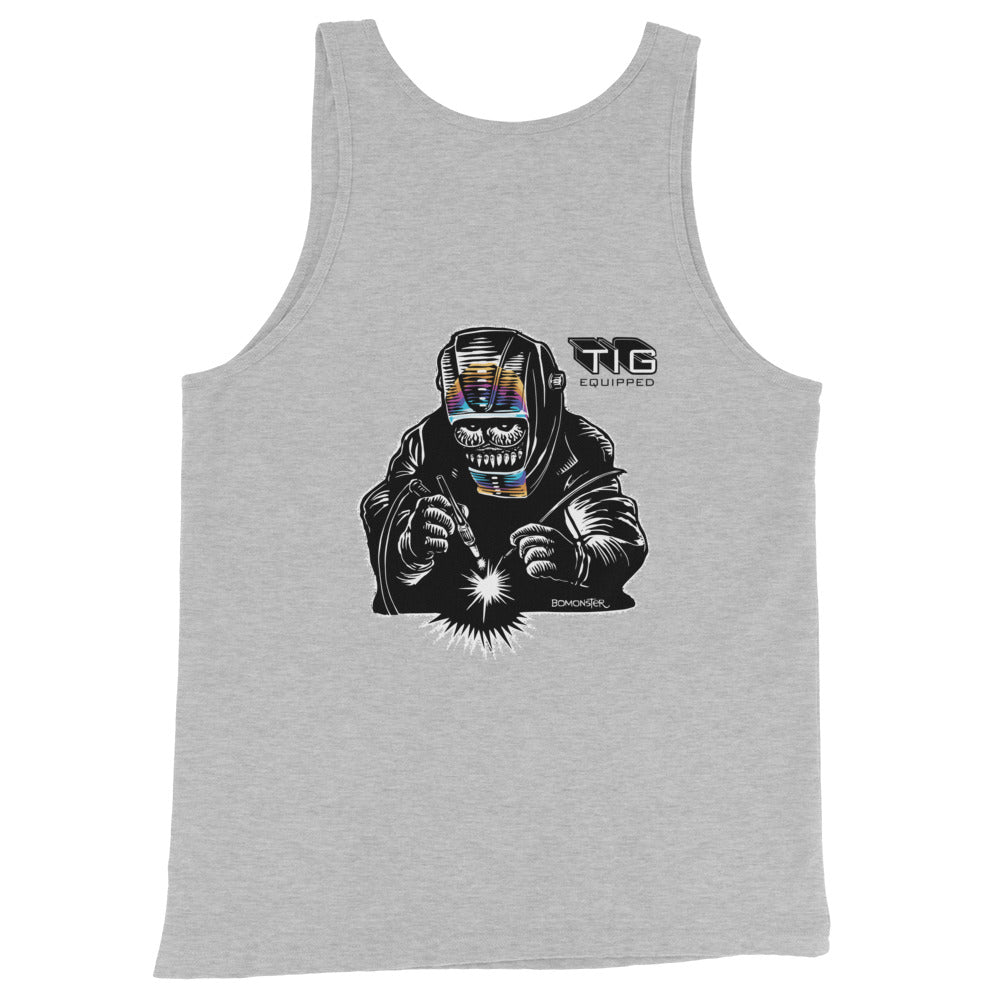 This 100% pre-shrunk cotton men's medium-weight tank top is a normal size fit. Lightweight feel is best for summer days and nights. Design is printed on back with a smaller TIG Monster graphic on front chest area.