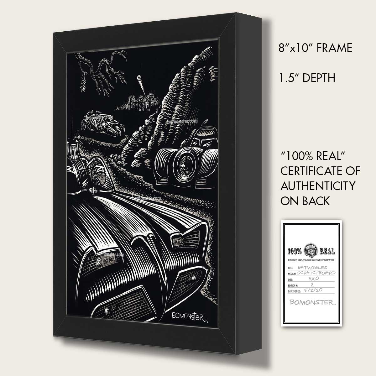- Art features three different Batmobiles from the original 1960s TV show to feature films.