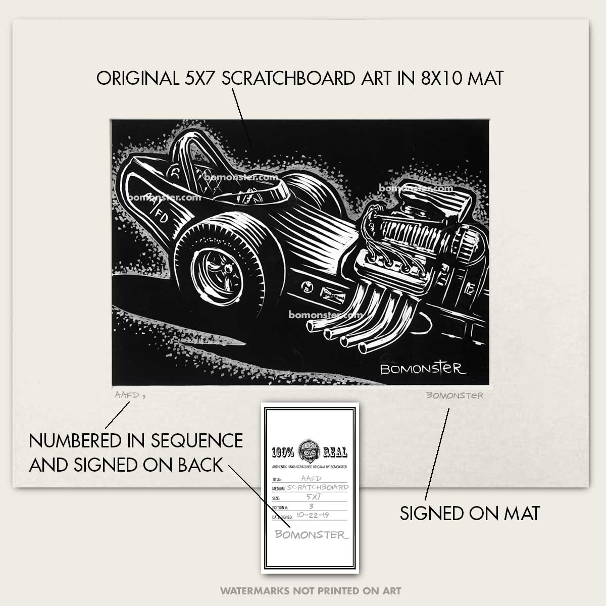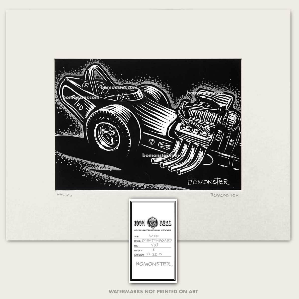 • Art features a nostalgic front engine AA class top fuel dragster.