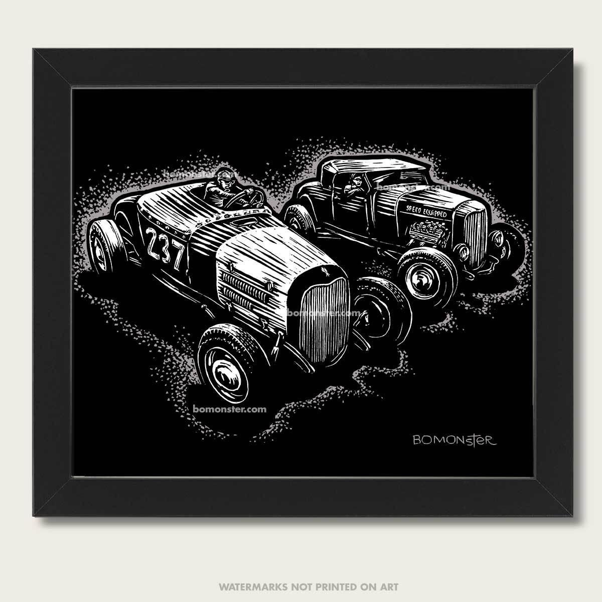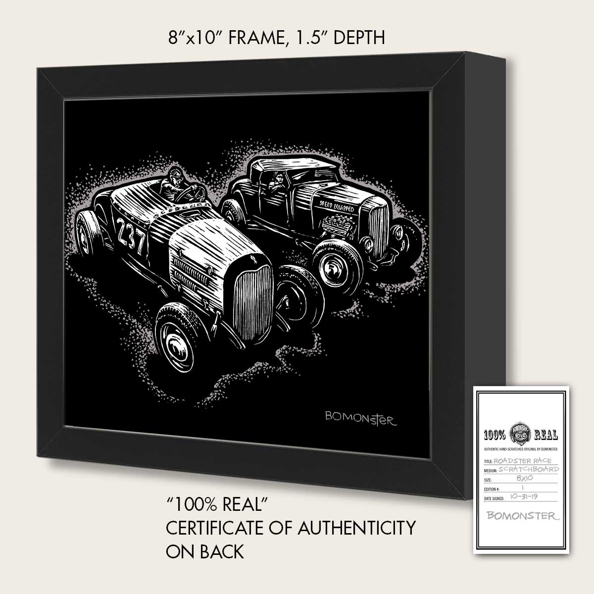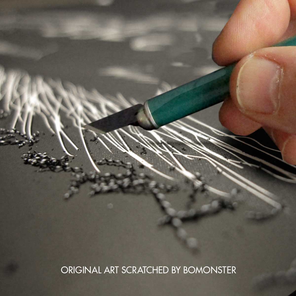 • This 8X10” original work of art is hand-scratched on a piece of 1/8th scratchboard and comes with a smooth black wood frame with a wire hanger. Background edges are created with an ink wash over scratched area.