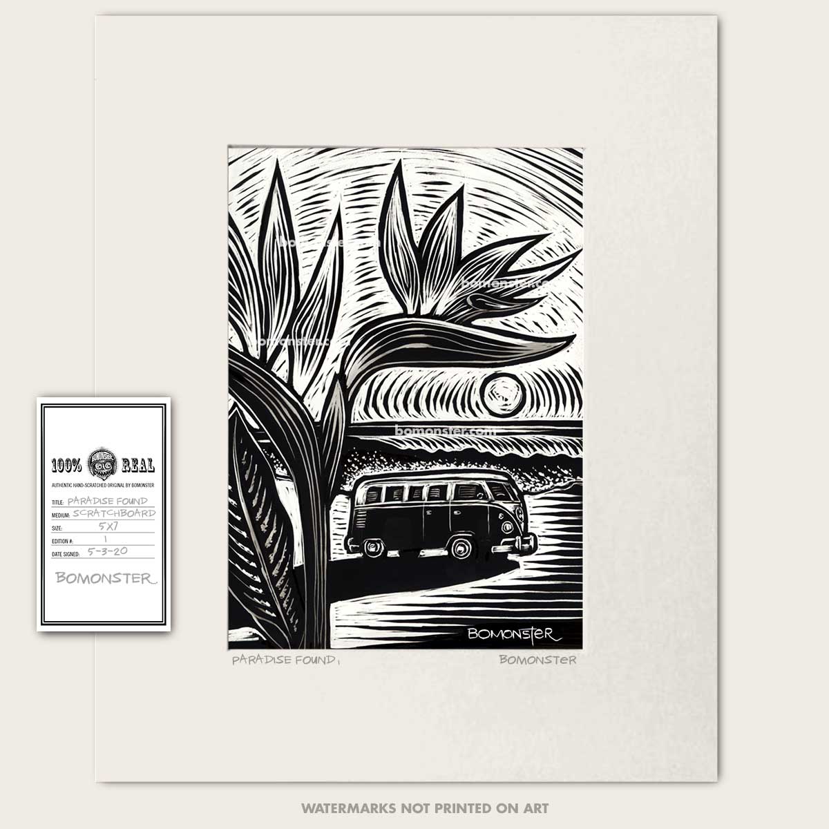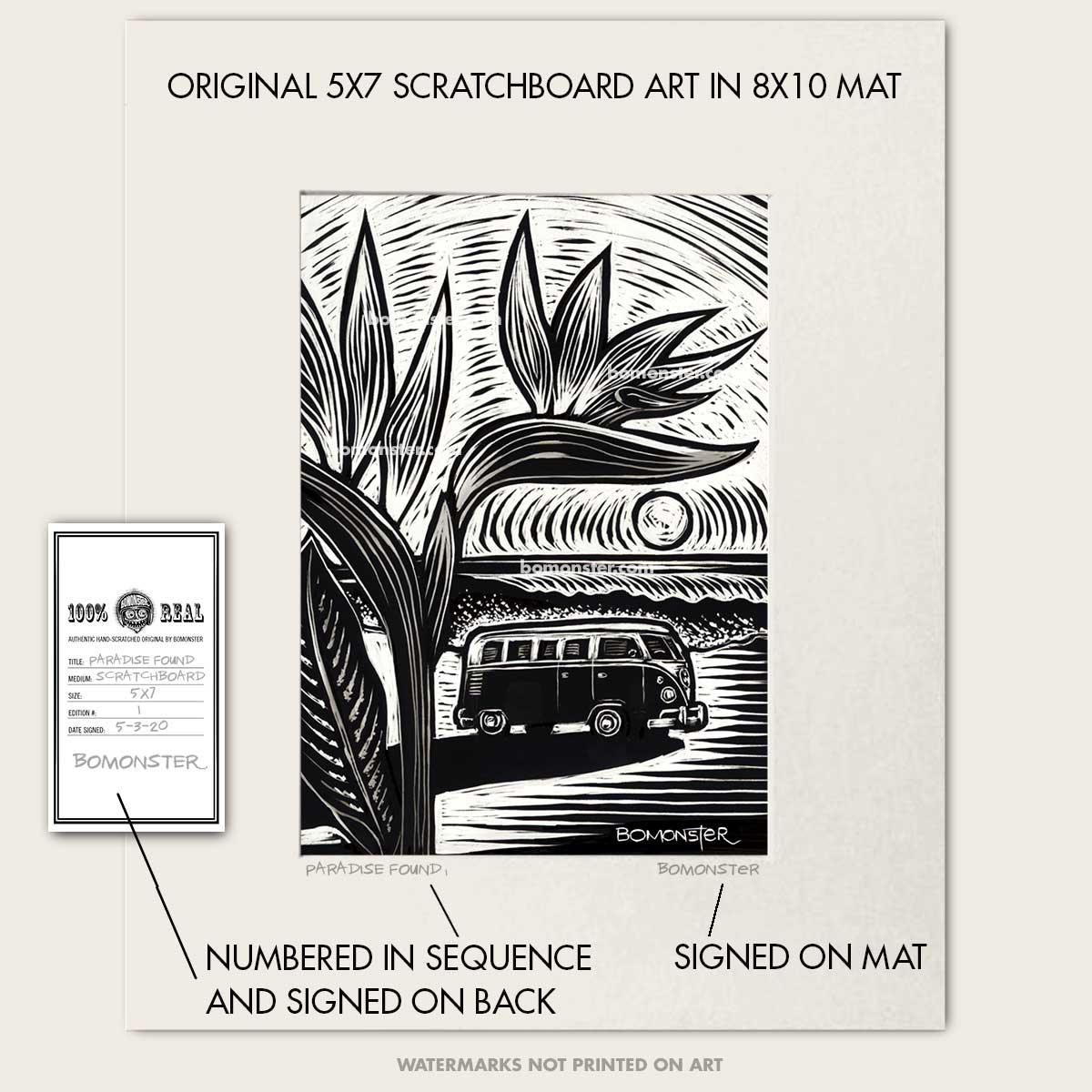 • This 5x7” original is hand-scratched on a piece of 1/8th scratchboard and comes with an 8x10 signed off-white archival mat ready to frame.